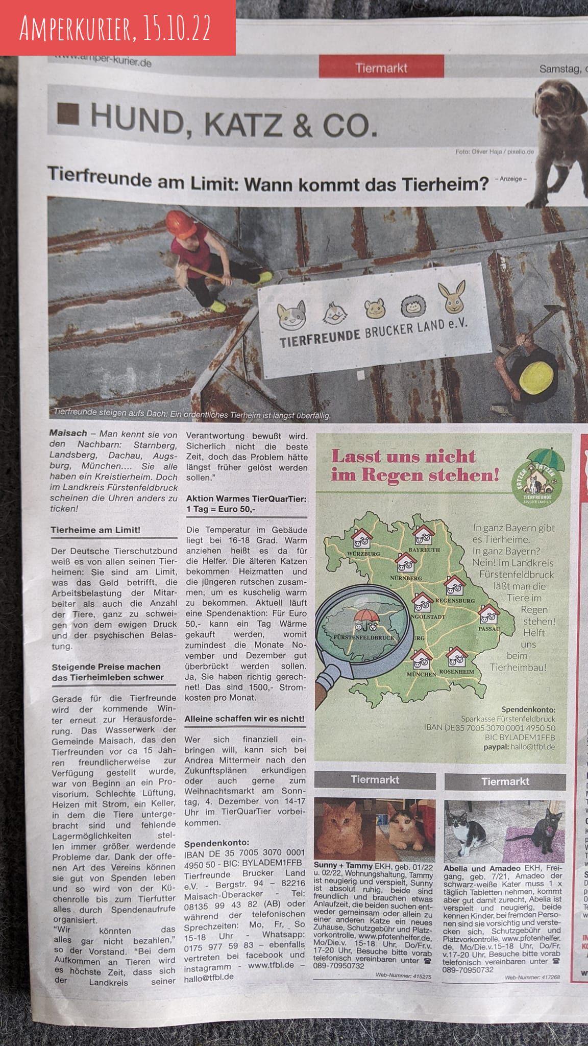 "Der Landkreis Fürstenfeldbruck hat im Gegensatz zu sämtlichen umliegenden Landkreisen kein zentrales Tierheim. Die Notwendigkeit, ein solches einzurichten, wird freilich immer dringlicher, weil die Räume der Tierfreunde Brucker Land im alten Wasserwerk im Maisacher Ortsteil Überacker marode sind. Wegen Schimmelbelastung und damit verbundener Gesundheitsgefährdung habe man die Innenräume schließen müssen, teilte Andrea Mittermeir, Vorsitzende der Tierfreunde, vor einiger Zeit in einem Video auf der Facebookseite des Vereins mit. Auch mit einer Demonstration vor dem Landratsamt machten die Tierfreunde jüngst auf ihr Problem aufmerksam. Von der Kommunalpolitik fühlen sich die Tierfreunde hingehalten."....