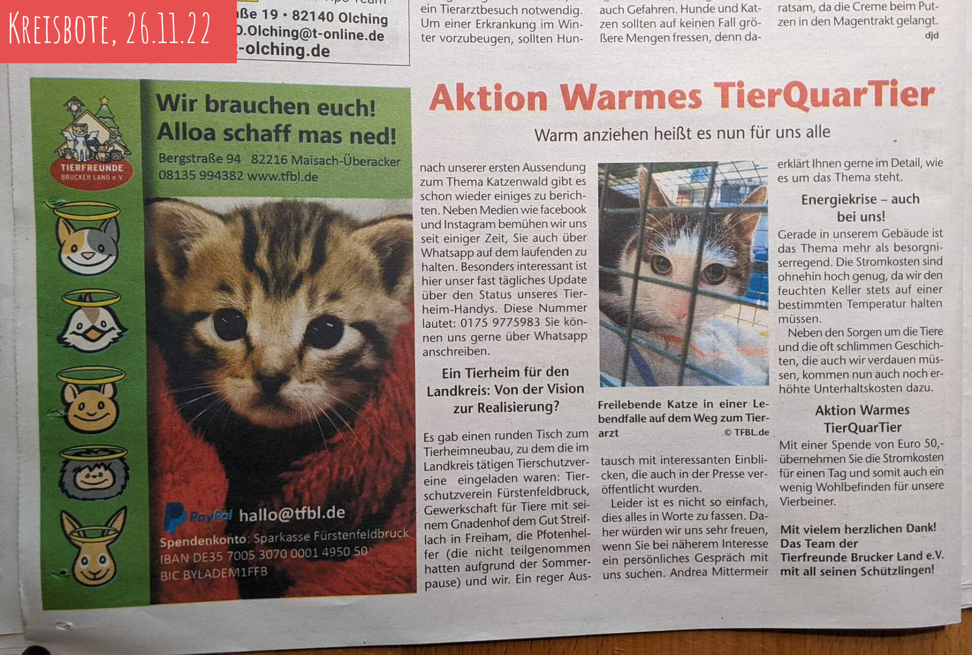 Die Tierfreunde können telefonisch unter 08135-99 43 82 oder per Email hallo@tfbl.de kontaktiert werden. Spenden gerne auf das Spendenkonto: IBAN DE 35 7005 3070 0001 4950 50 - BIC: BYLADEM1FFB